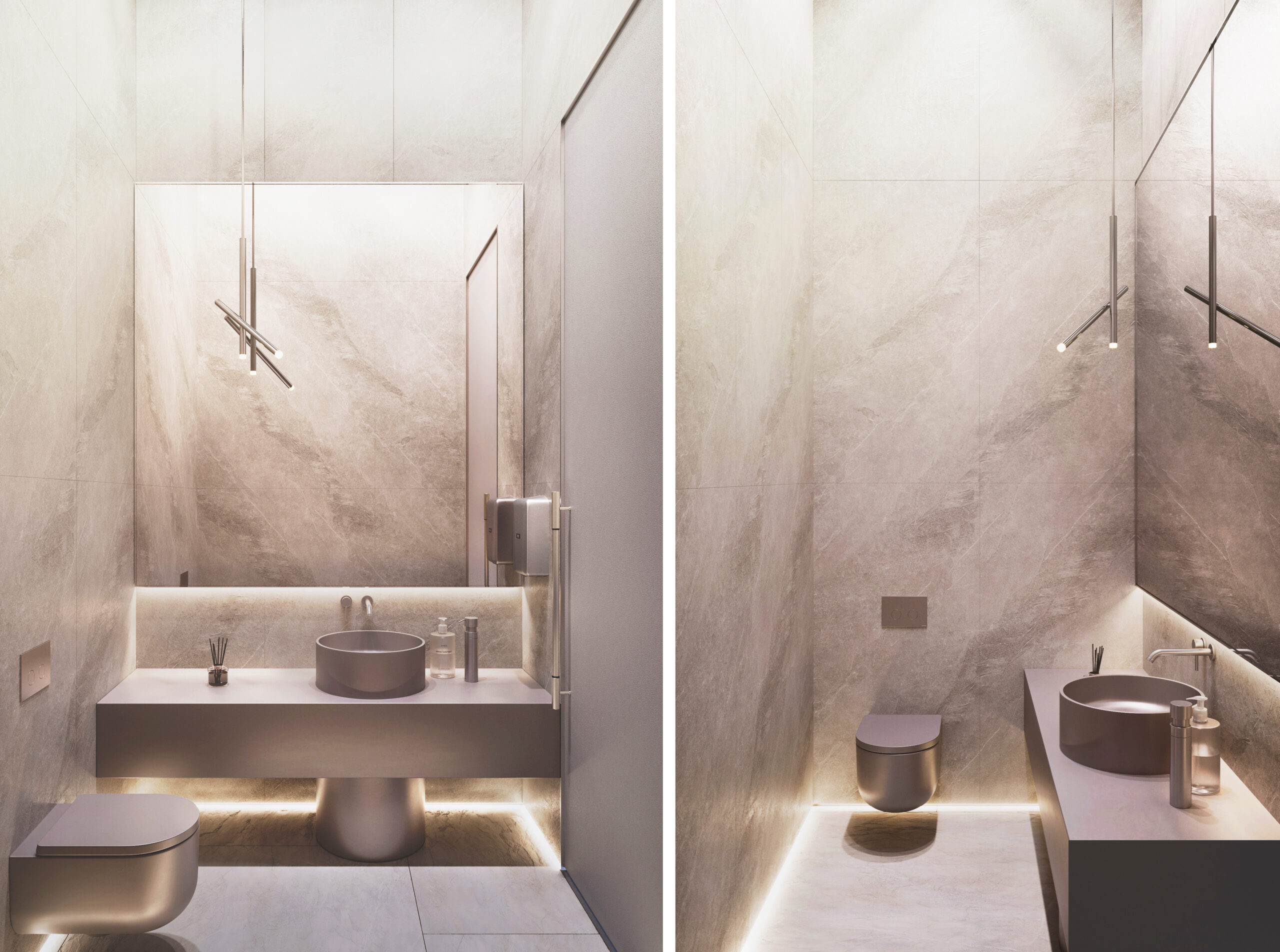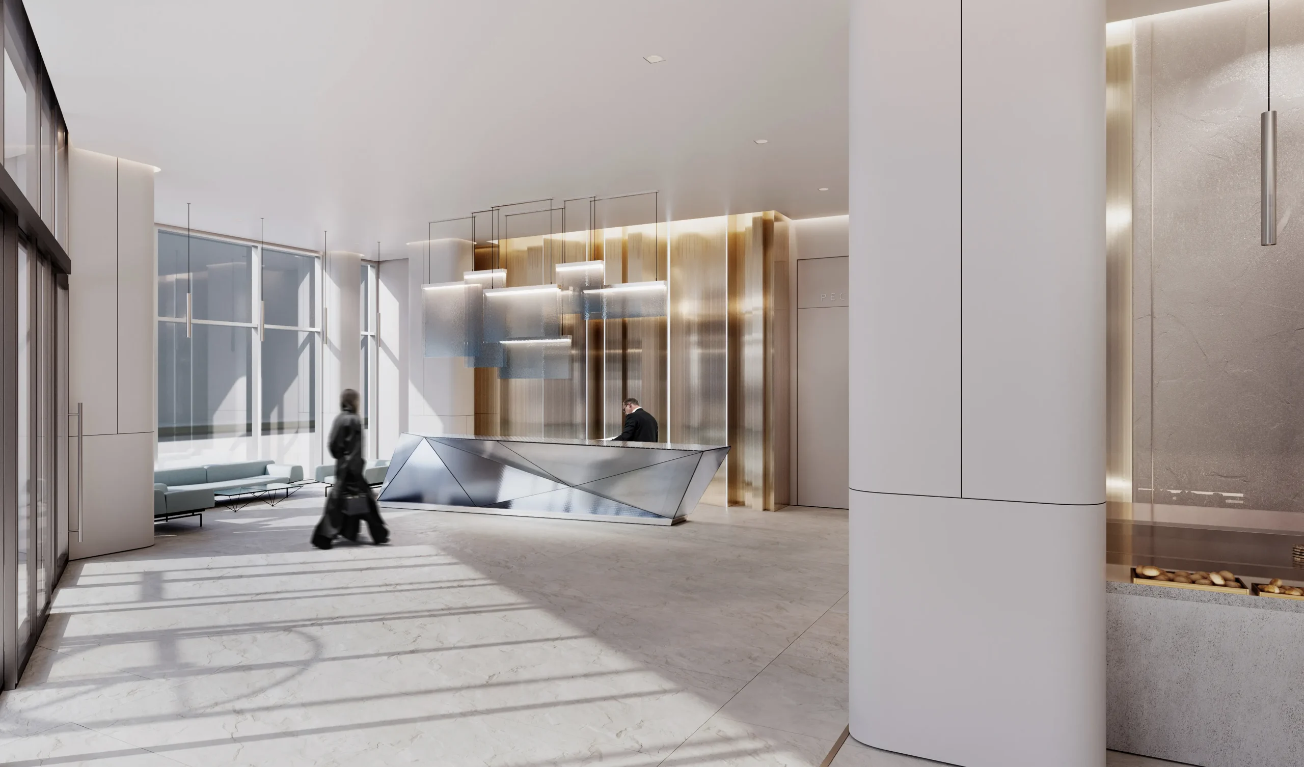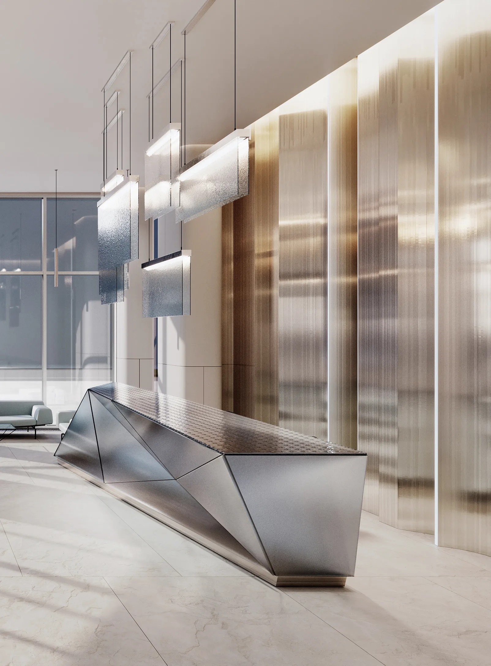 Конструктивная форма в виде кристалла находит отражение в использовании стеклянных и металлических деталей: ломанных линий стоек ресепшн и бара в фойе на первом этаже, светильниками в виде ледяных пластин, латунным панно сложной формы с подсвеченными гранями, мебелью и другими элементами декора с латунными деталями, перекликающимся с латунными акцентами фасада.