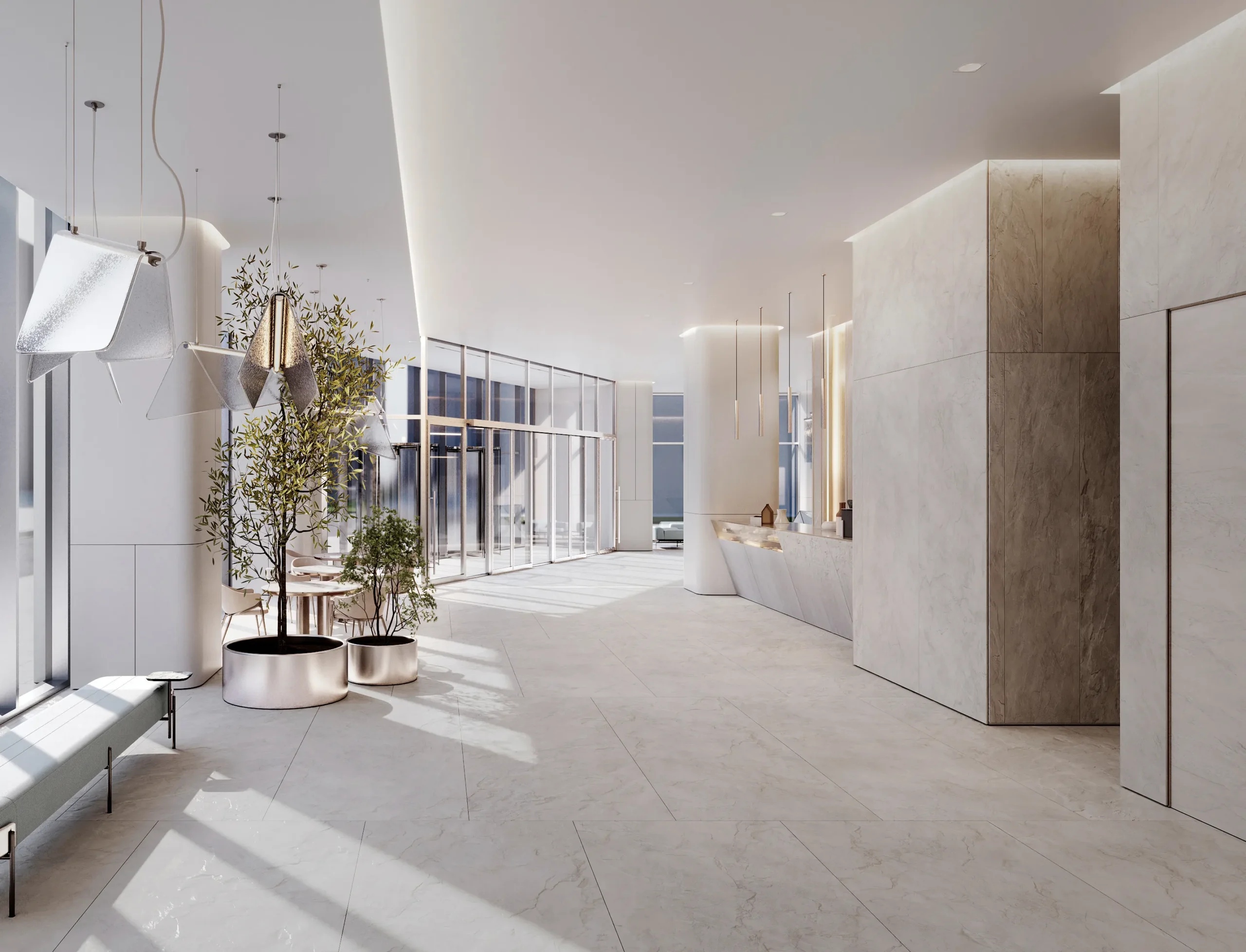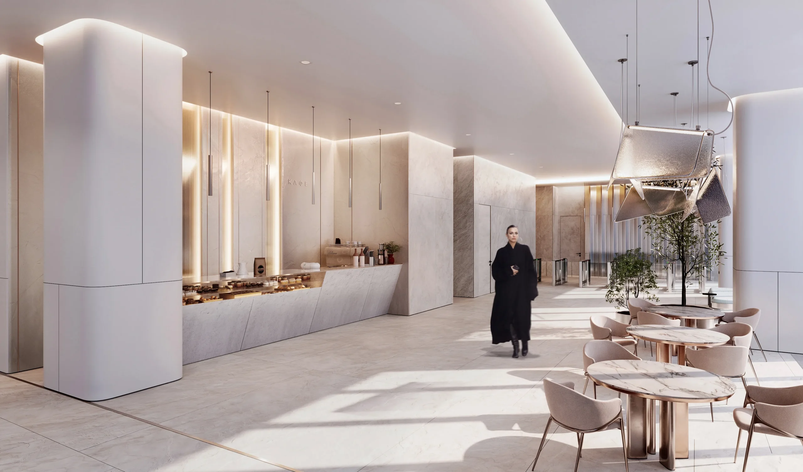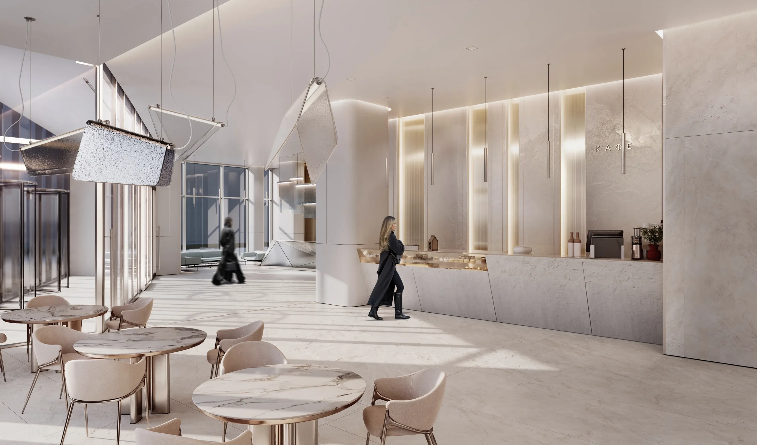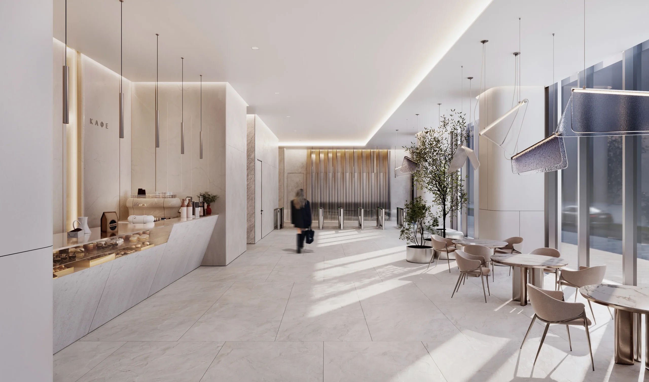 Голографические очертания БЦ "Северный порт" нашли логическое продолжение в его интерьере, разработанном архитектором АБ KANVA Moscow Анной Волынцевой в едином подходе с концептуальным решением здания.