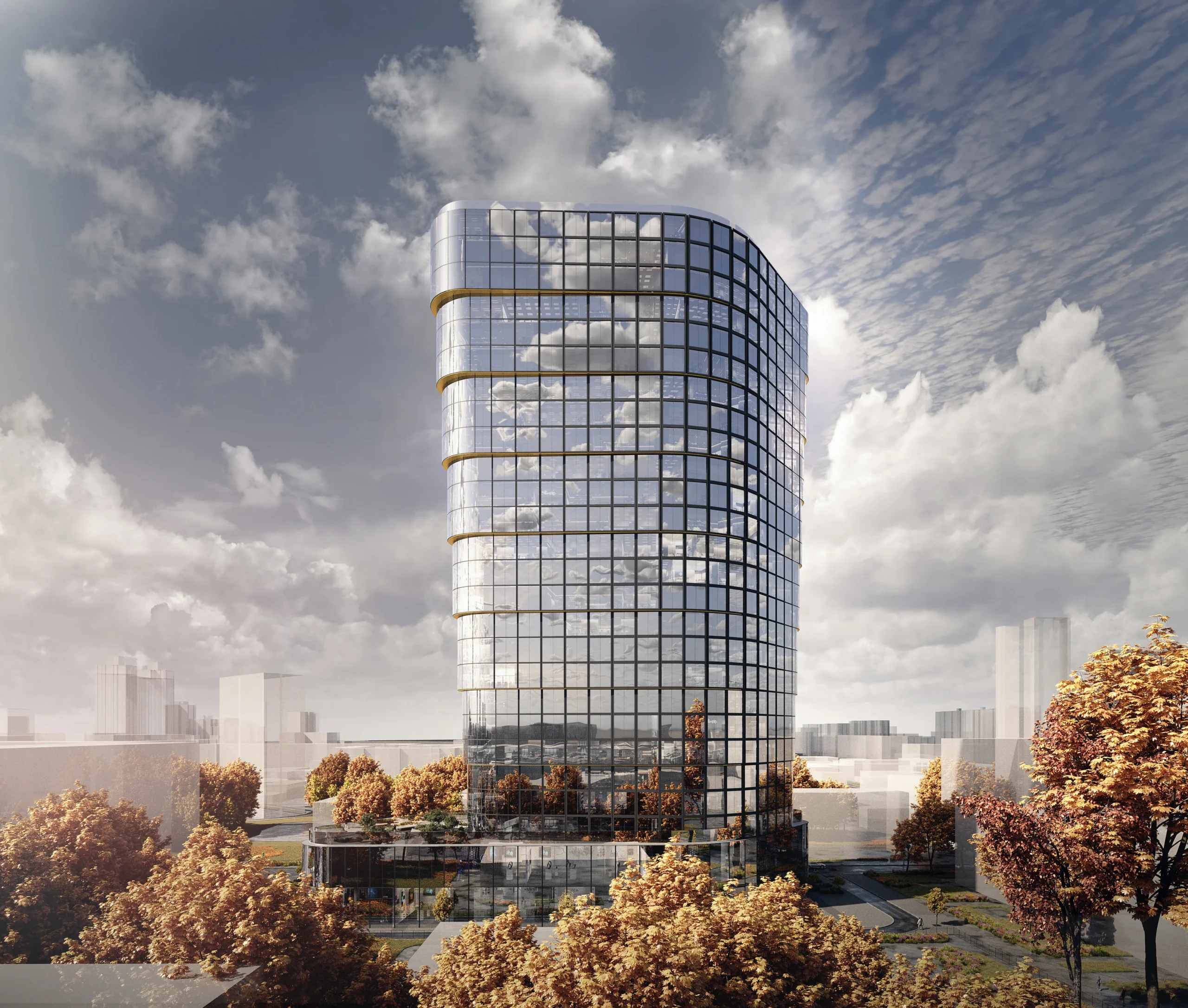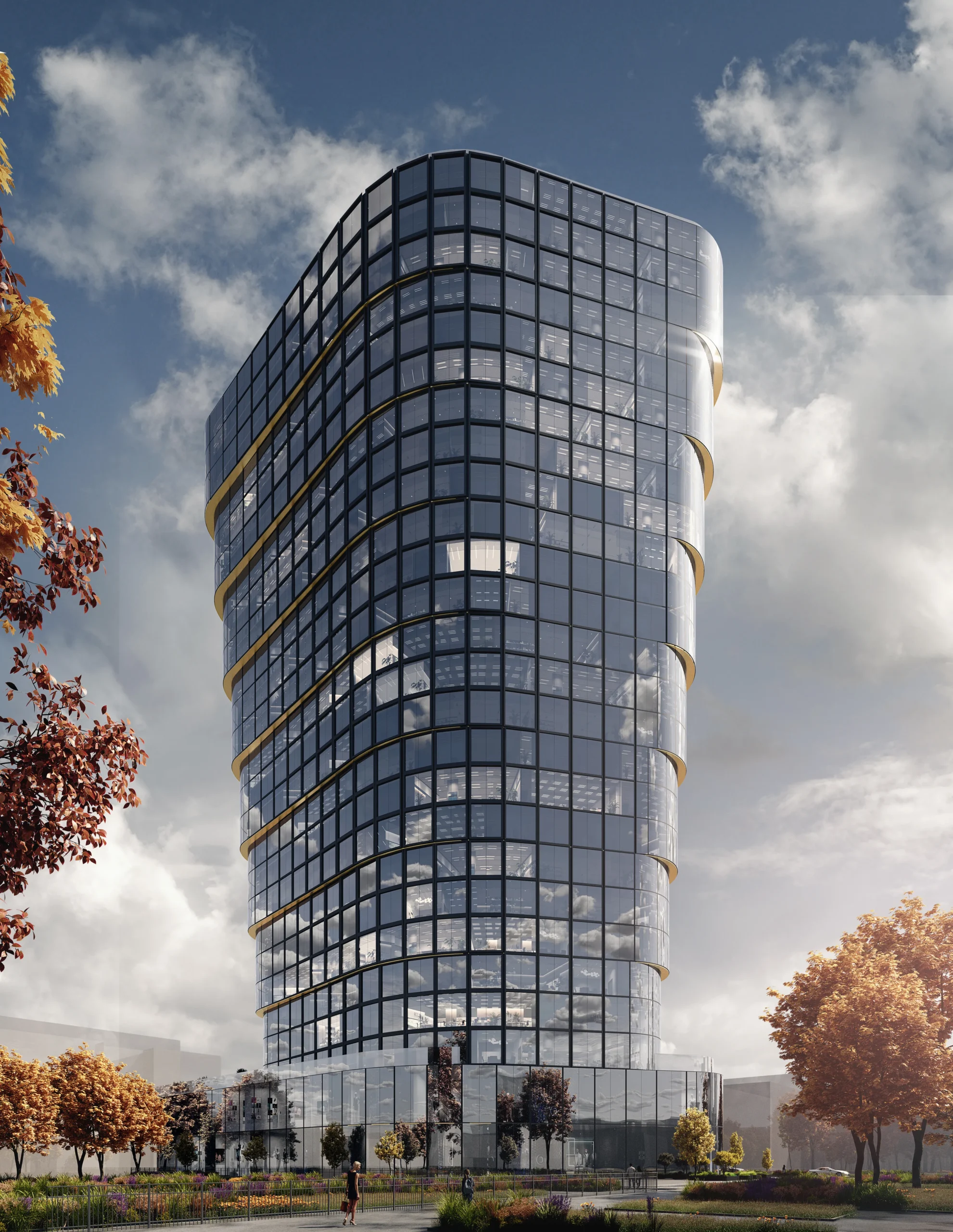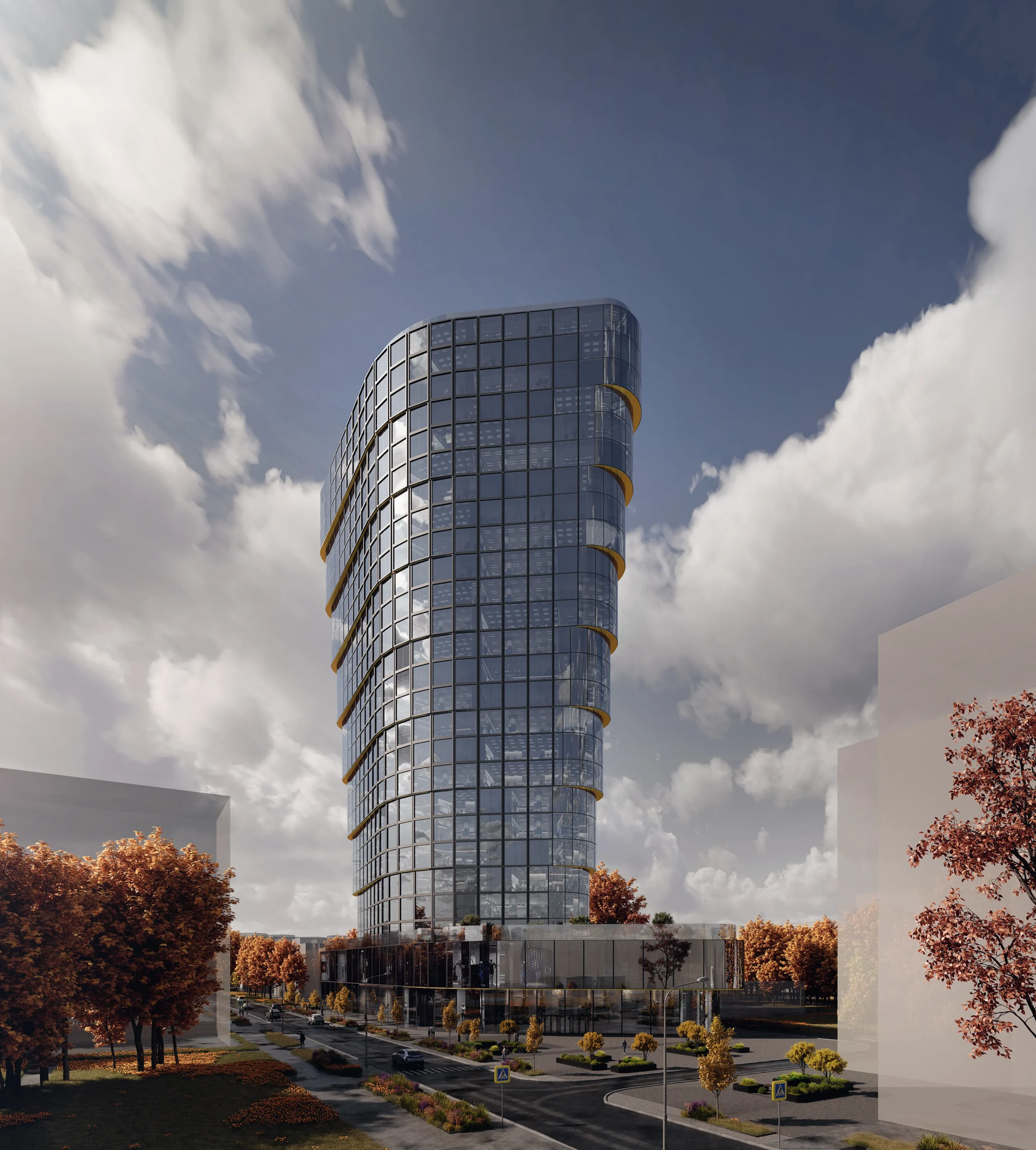 Бизнес-центр задуман как выразительная вертикальная доминанта, формирующая новый визуальный ориентир в структуре района. Архитектурный образ здания основан на плавной, обтекаемой форме объёма, которая контрастирует с жёсткой геометрией окружающей квартальной застройки и подчёркивает общественный статус объекта.