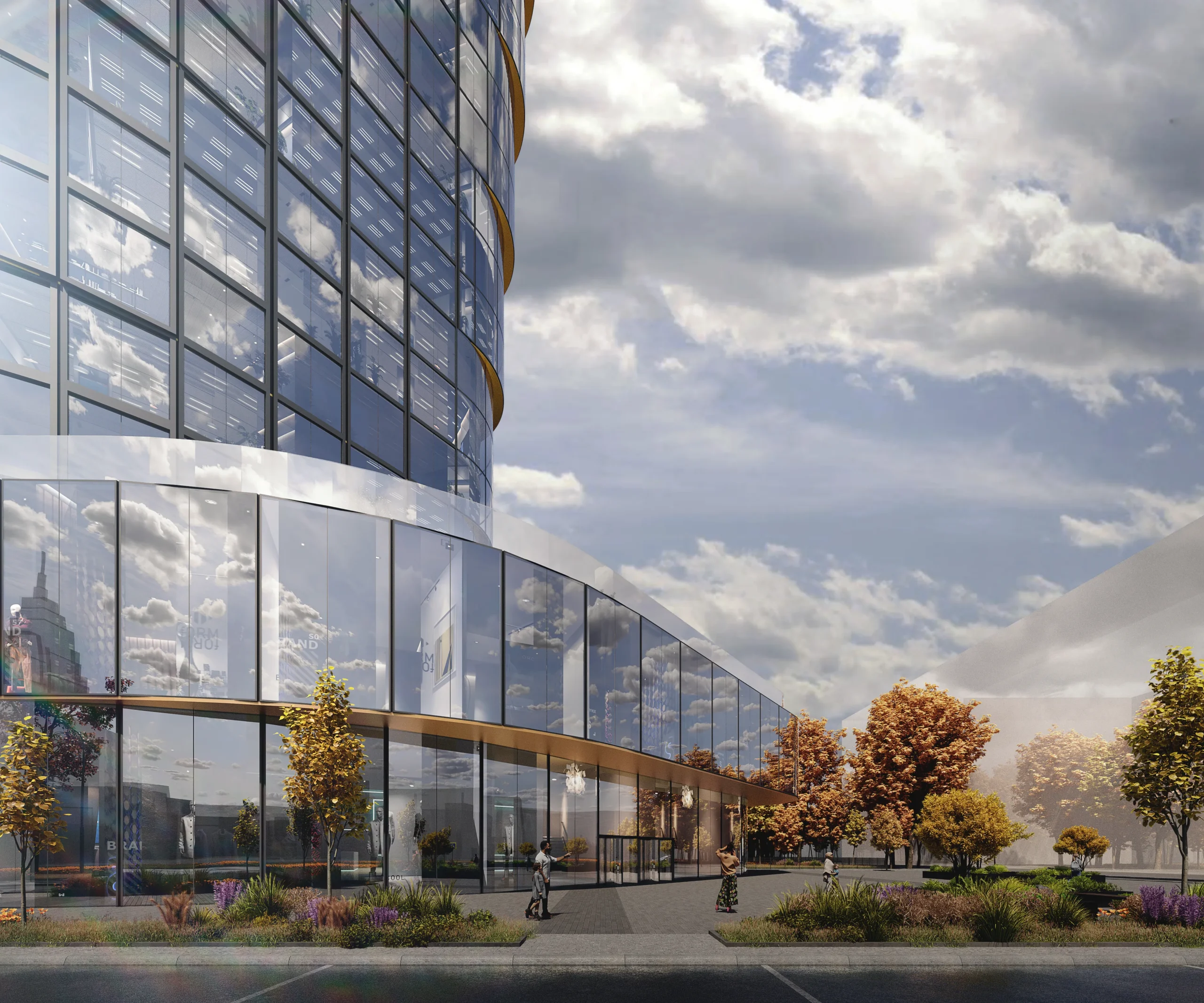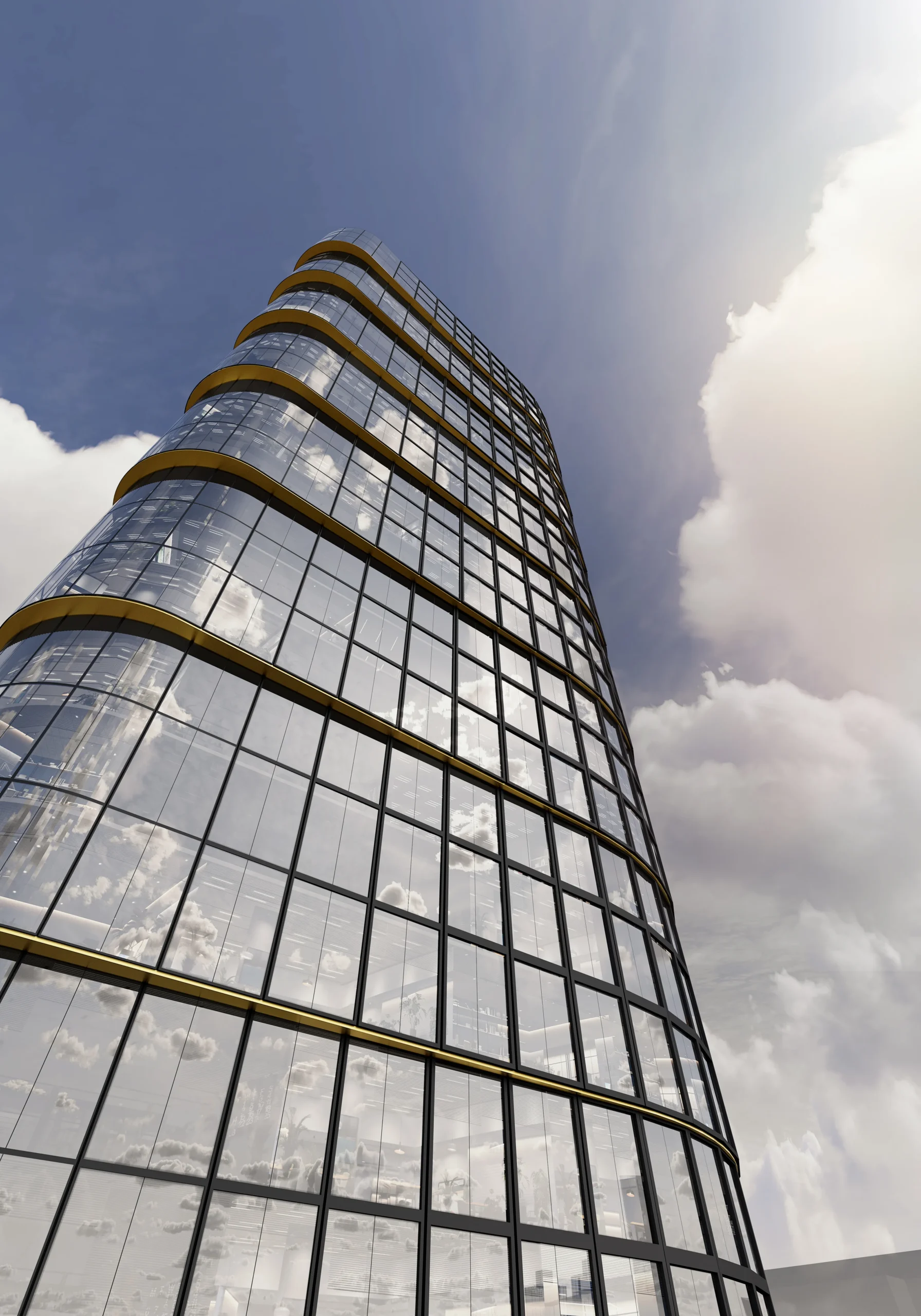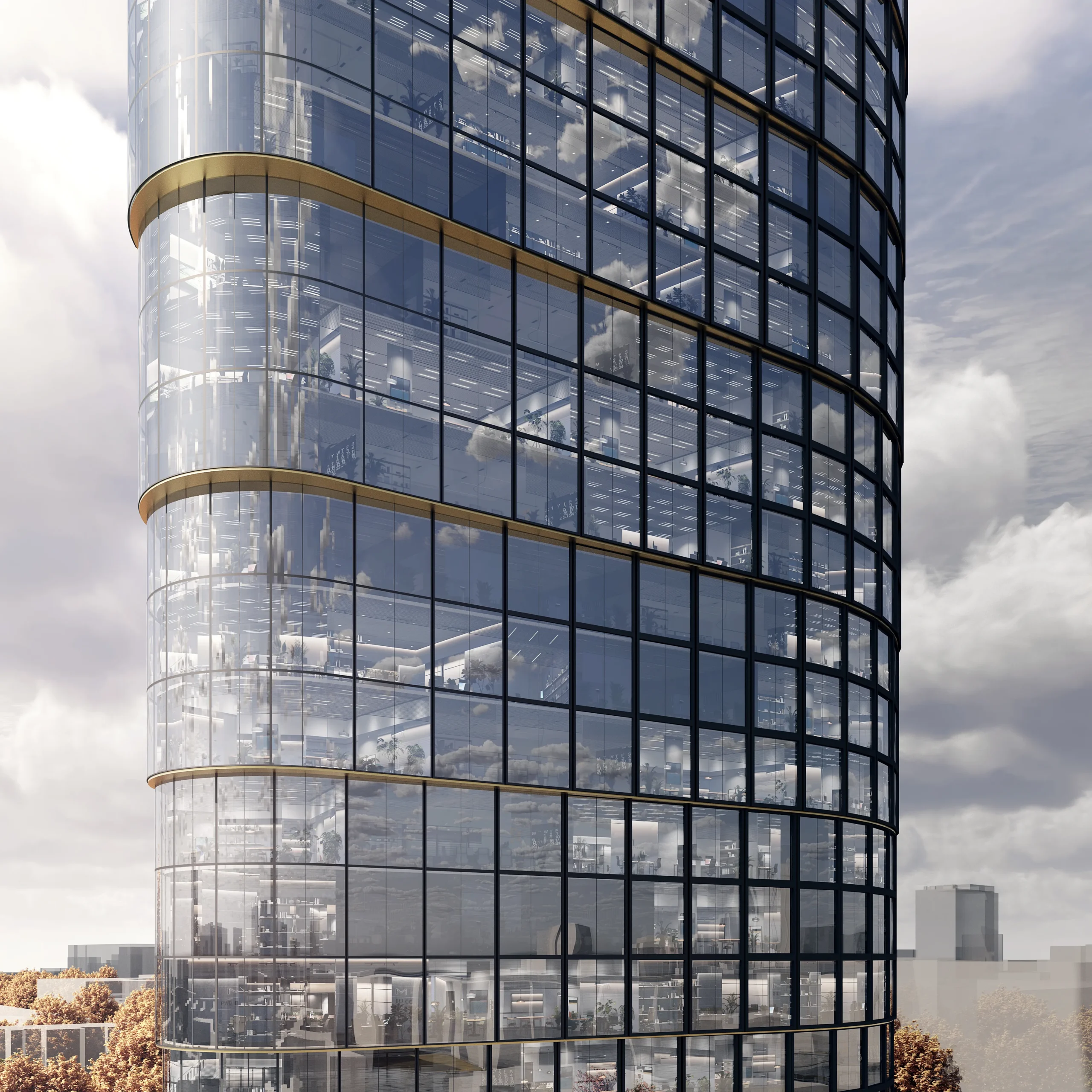 Фасадное решение основано на ритмичной стеклянной сетке, которая отражает небо, подчеркивая вертикальную динамику, и создает эффект изменчивости контуров в зависимости от освещения и времени суток. Горизонтальные акцентные пояса, выделенные латунью, работают как визуальные маркеры этажей, добавляя динамику и масштаб.