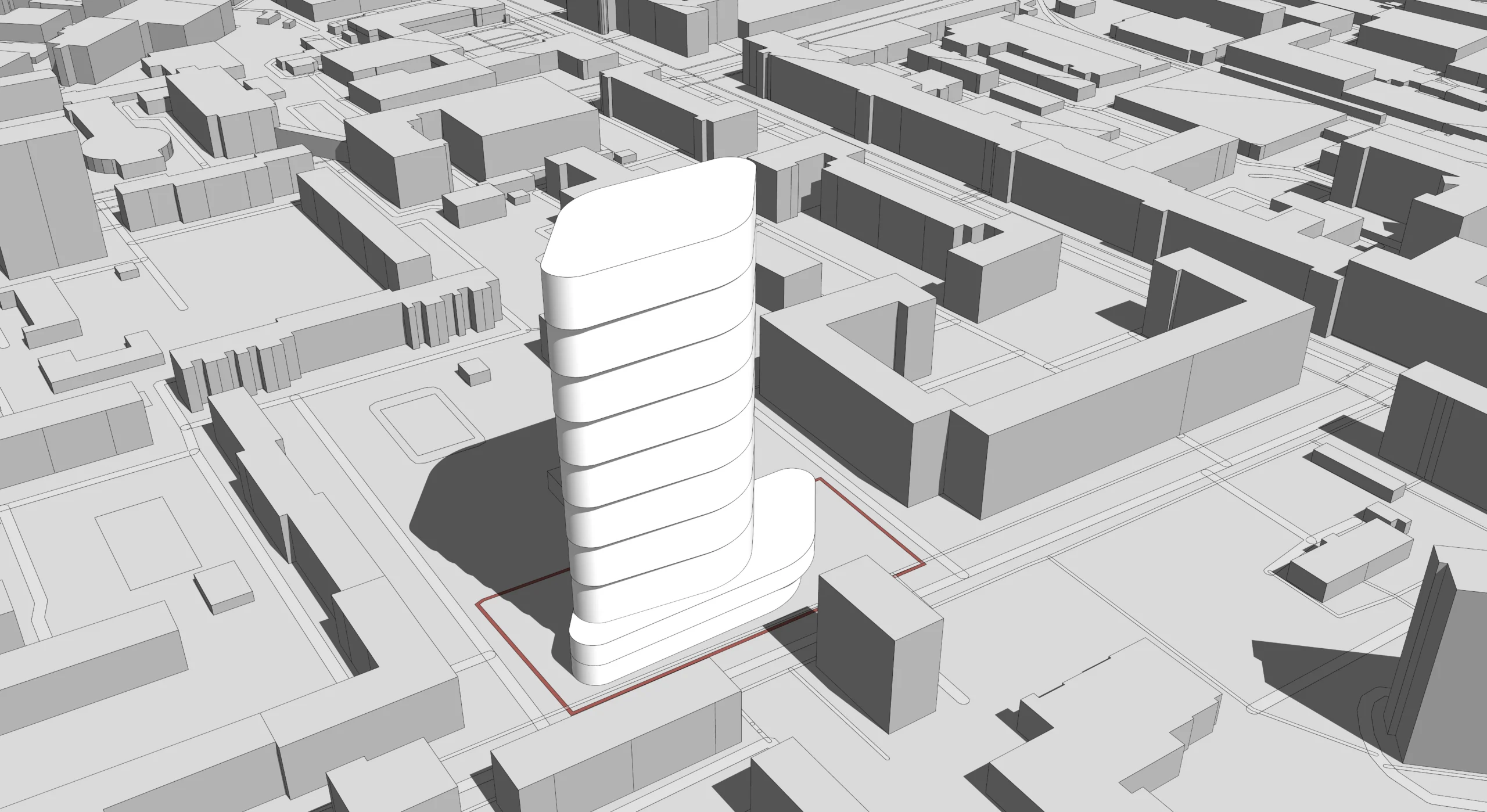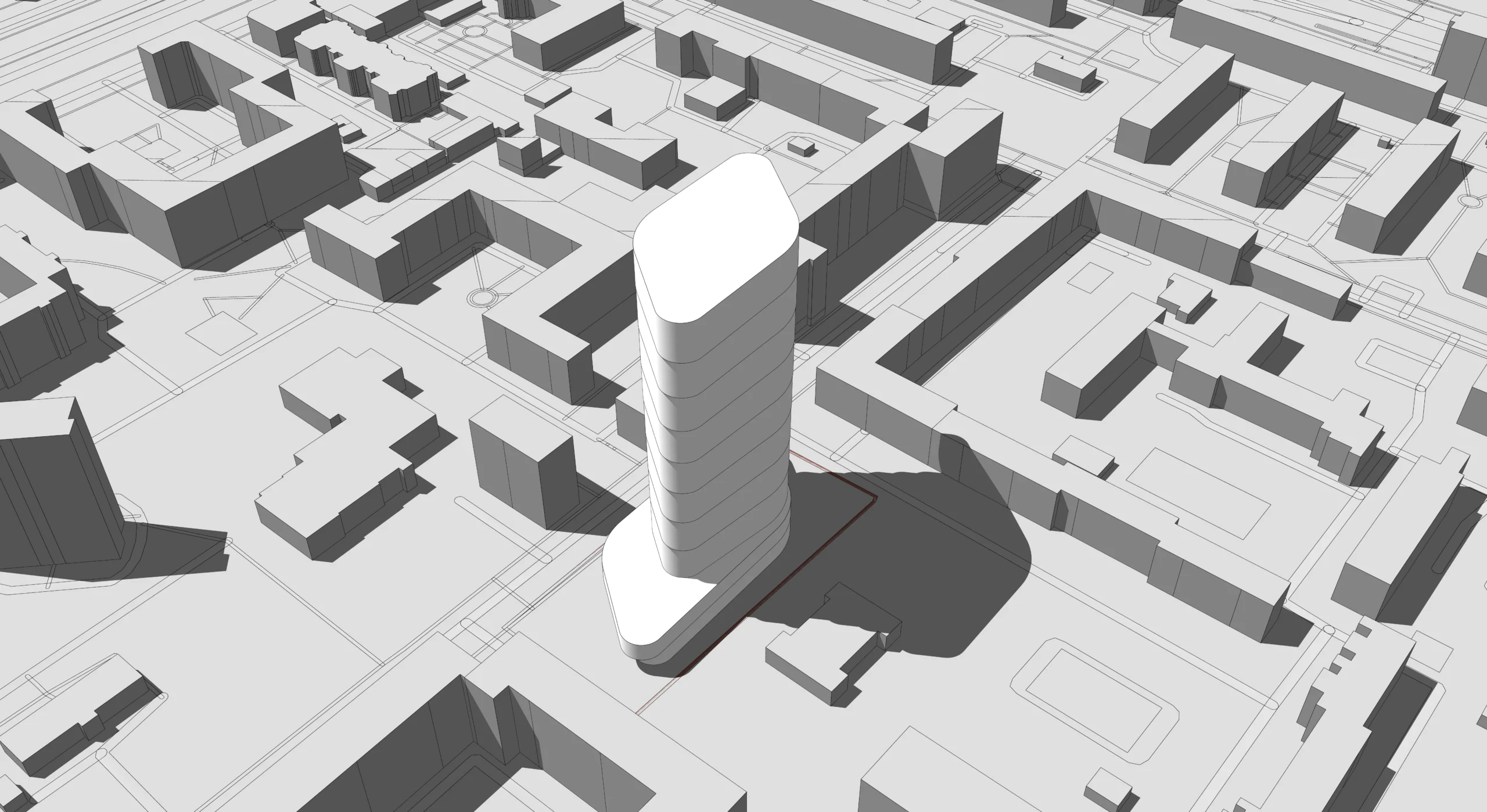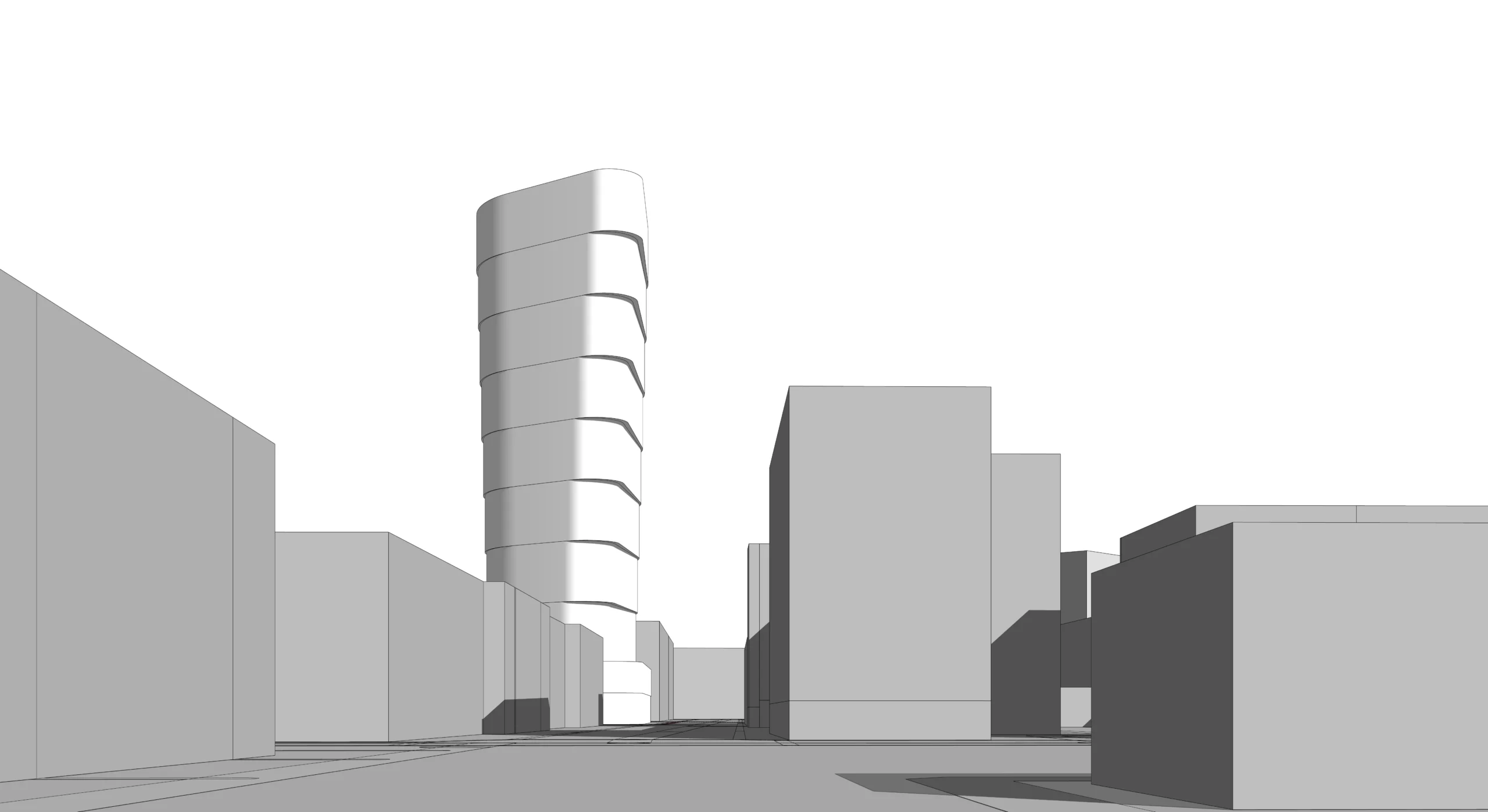 В градостроительном отношении объект встроен в существующую ткань как самостоятельный акцент, не нарушающий баланса застройки. Его форма и ориентация учитывают визуальные коридоры и окружение, а пластика объёма позволяет смягчить масштаб высотного здания по отношению к соседним кварталам.