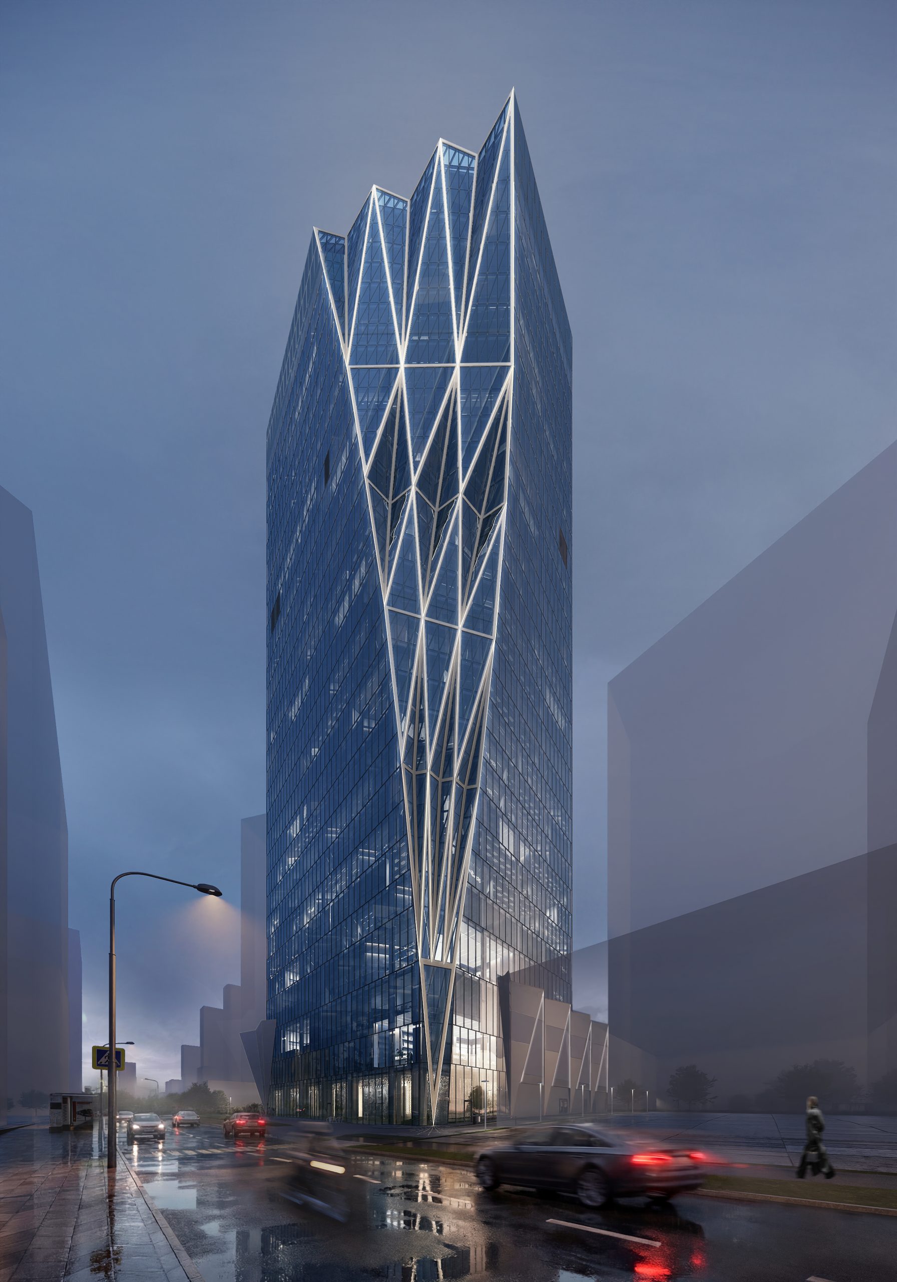Выразительная пластика поддержана характерным конструктивным решением. Наклонные колонны проходят по всей высоте здания, формируя непрерывный вертикальный конструктивный каркас, усиливающий динамичный силуэт башни. Эти элементы интегрированы в архитектурный язык объекта, подчёркивая направленность движения вверх и создавая ощущение кристаллического напряжения. Конструктивный ритм становится частью фасадной артикуляции, объединяя инженерную логику и художественную выразительность.